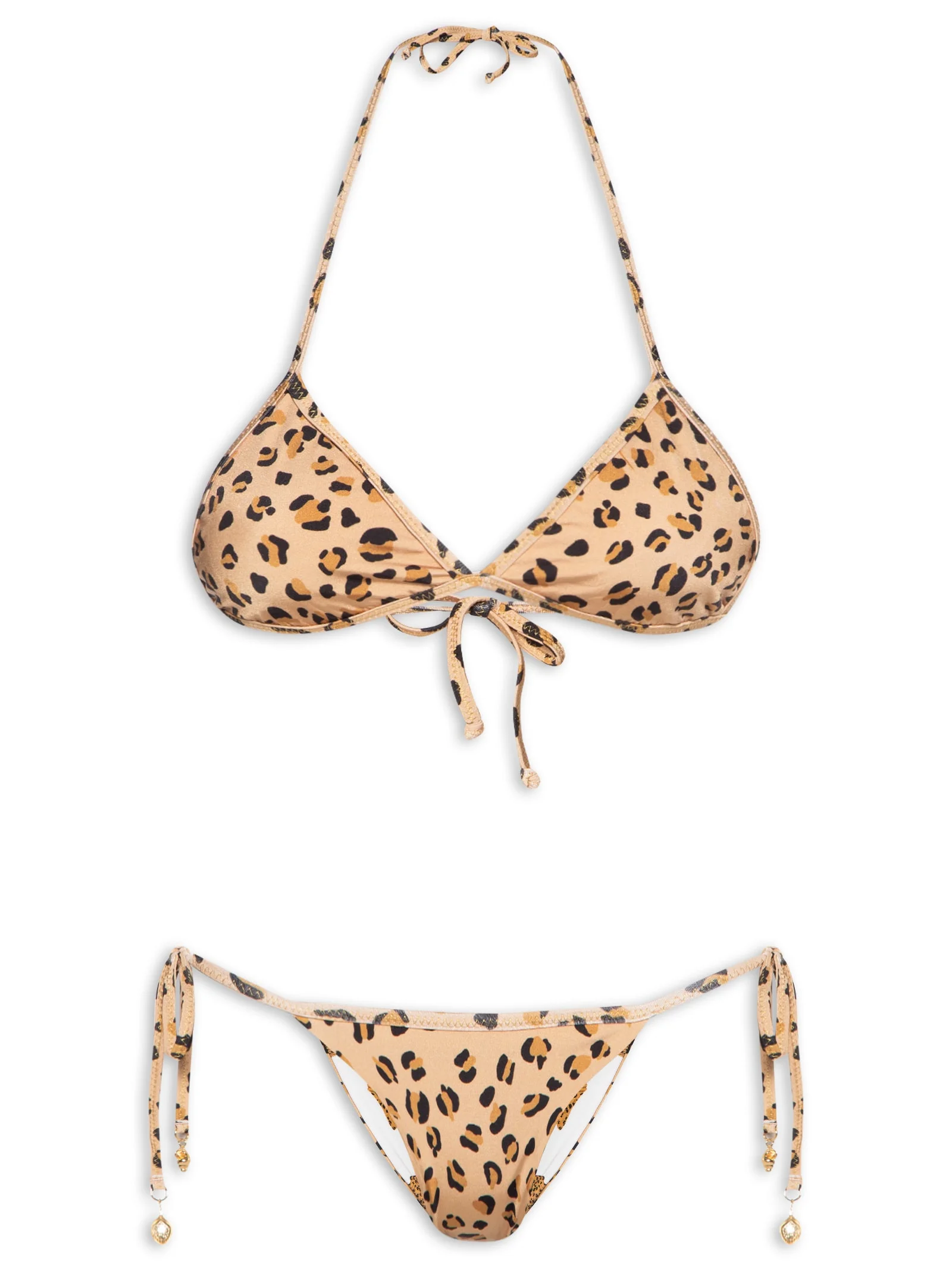 O biquíni animal print é confeccionado em malha de poliamida com média elasticidade. O top de modelo dupla face possui alças finas, padronagem animal print, forro, sem bojo e fechamento posterior por amarração. A outra face possui estampa figurativa de conchas em cores contrastantes. A calcinha de modelo dupla face possui cintura baixa, laterias finas, padronagem animal print, forro e fechamento nas laterais por amarração. A outra face possui estampa figurativa de conchas em cores contrastantes.