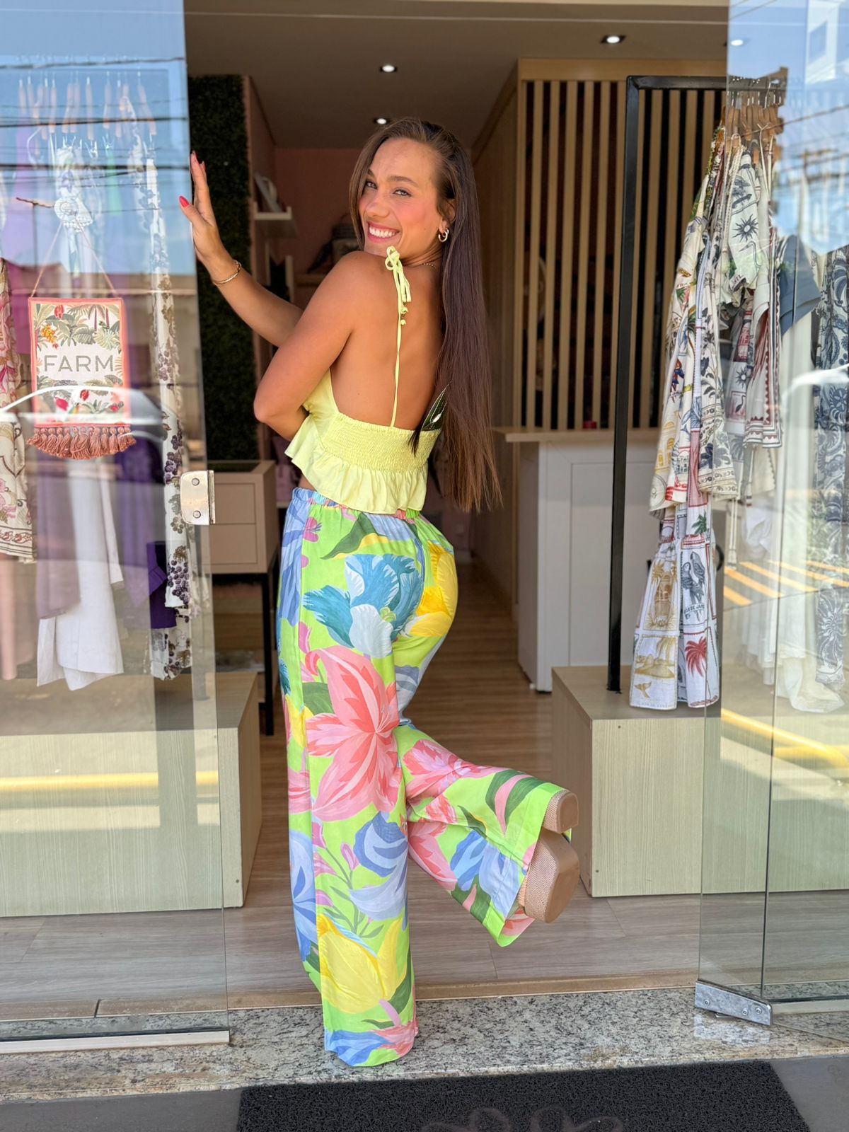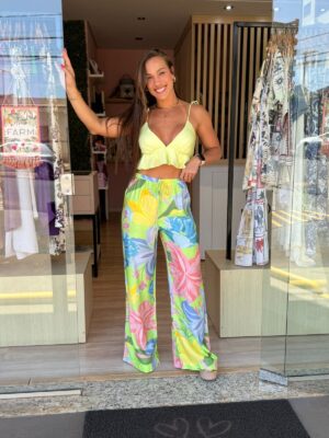A modelagem é reta. Possui cintura alta e cós médio, finalizada por elástico com amarração. Peça confeccionada em tecido leve e sem elasticidade.