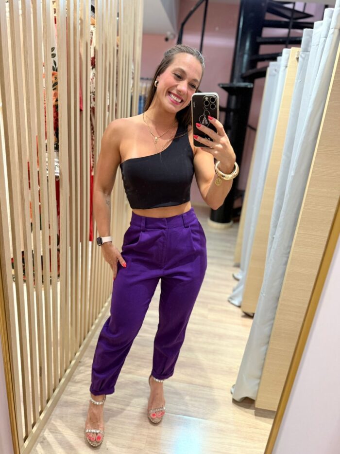 Descrição: Calça Cenoura Linho.possui modelagem cenoura, pences frontais, bolsos laterais, fechamento com zíper/botões.