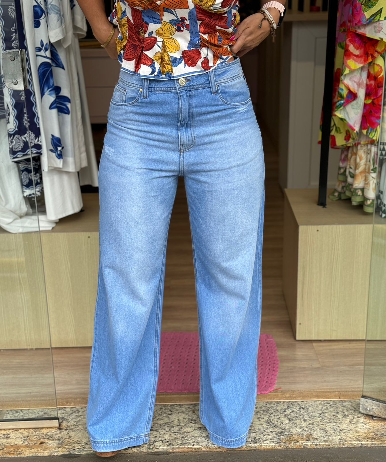 Descrição: Calça jeans wide leg denim modelo pantalona , possui bolsos frente e trás, fechamento zíper e botões.