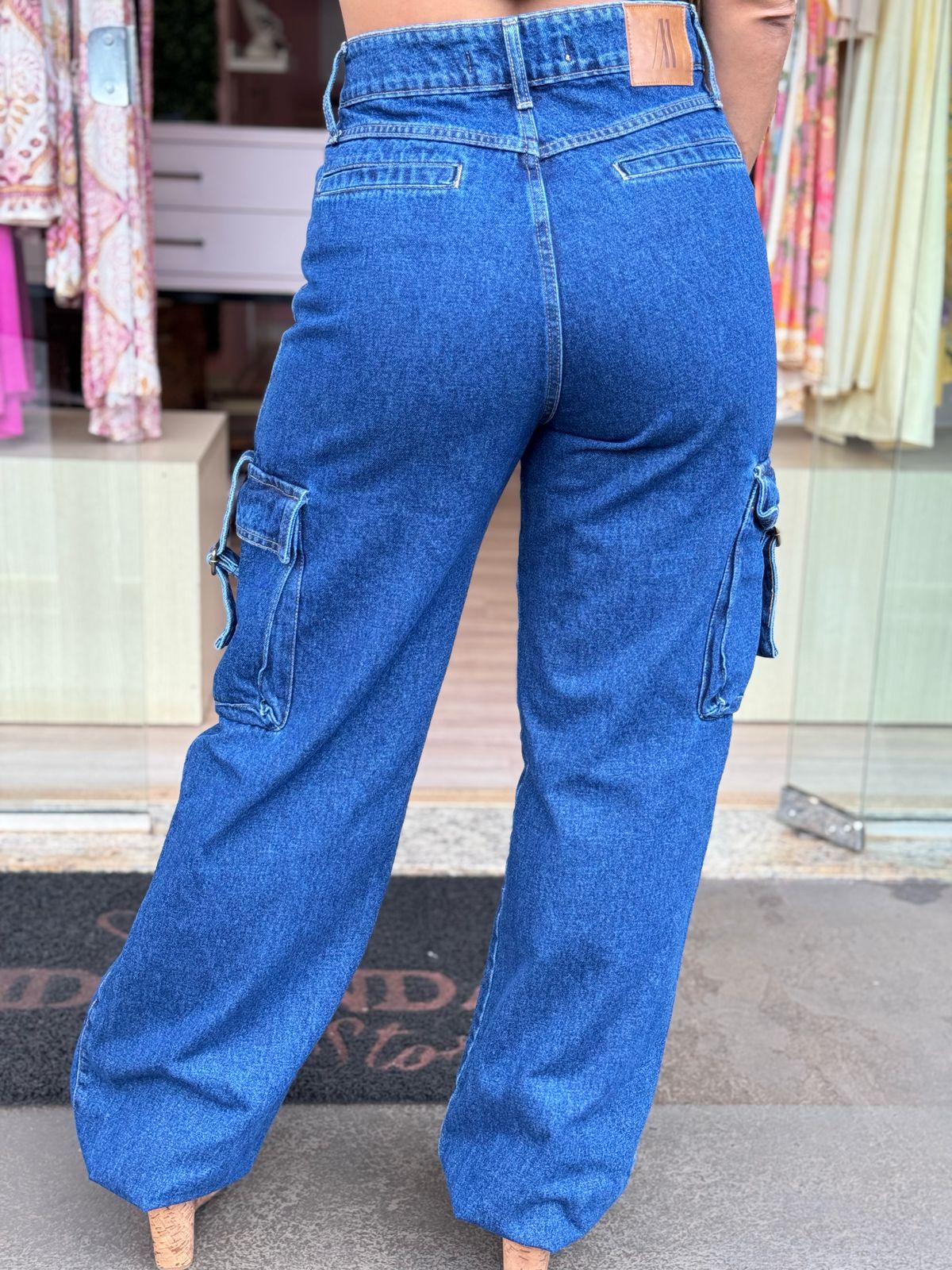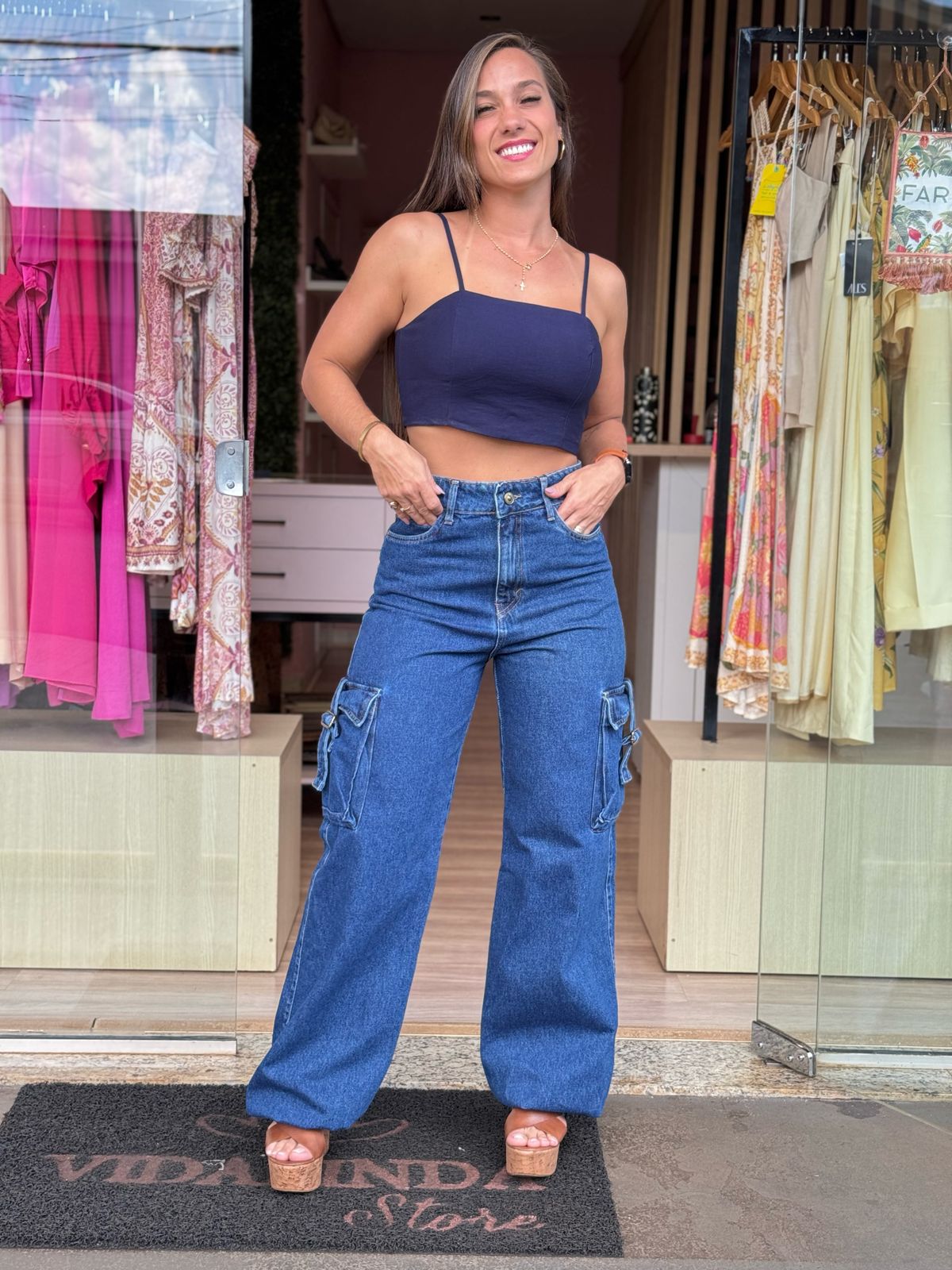 Descrição: Calça Jeans Wide Leg Regina Regulagem. Calça Possui bolso do lado. Zíper e botão. Passante de cinto. Modelagem larga. Contém regulagem na barra da calça. Possui Bolso falso atrás e bolso na frente.
