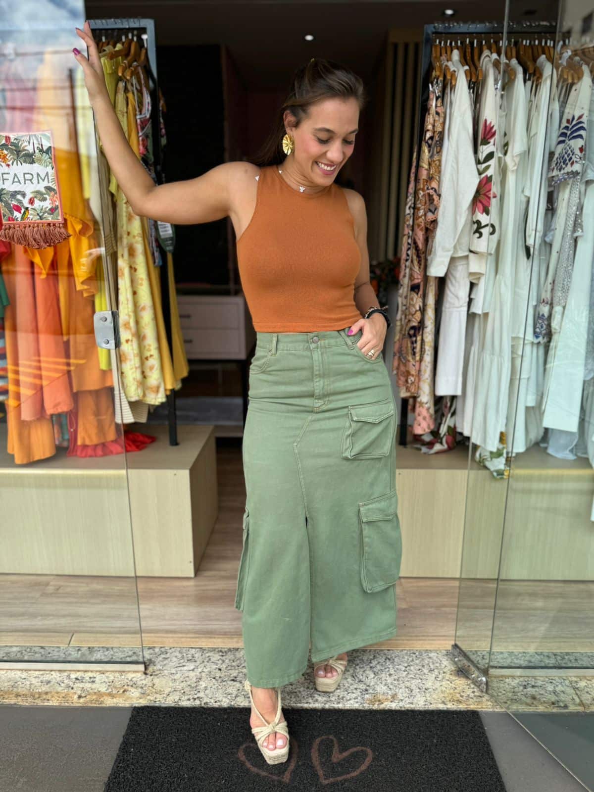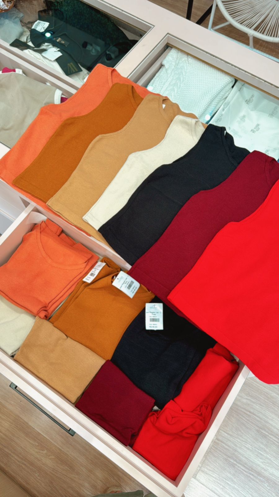 Descrição: Cropped Regata Lisa. Regata em trico. Ela é tamanho único e veste de um 36 ao 42. Possui alças largas.