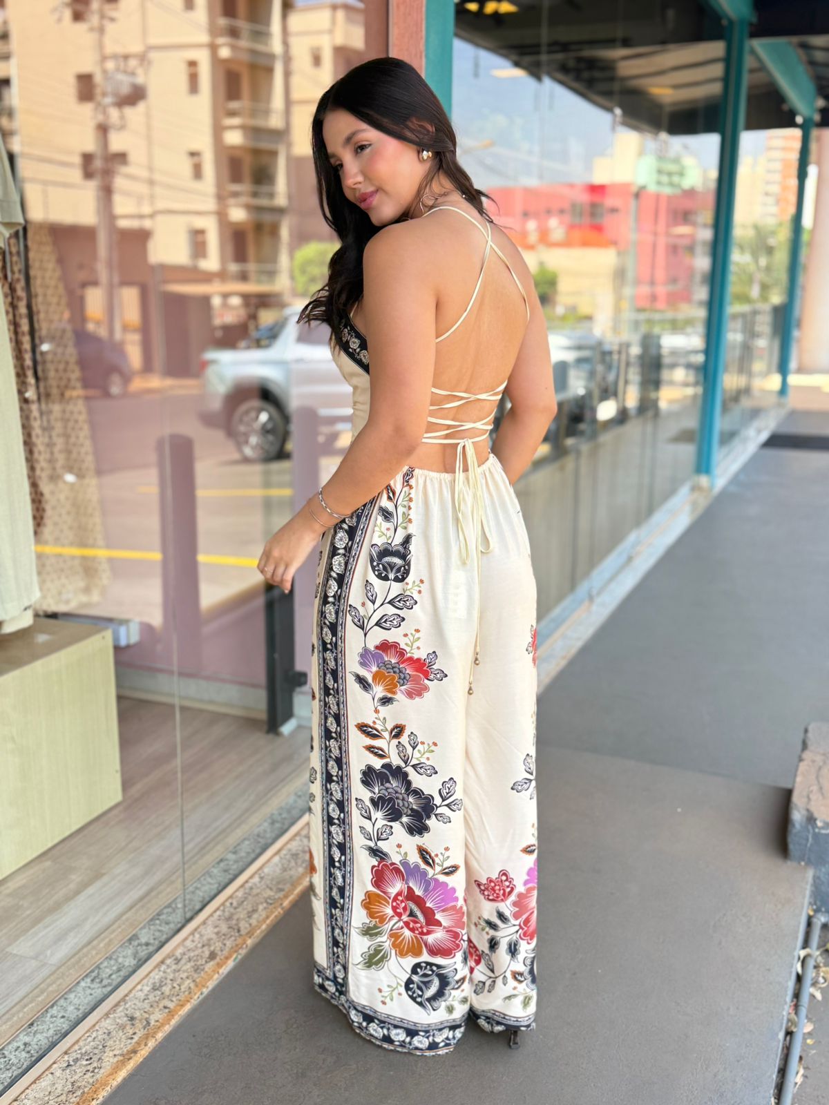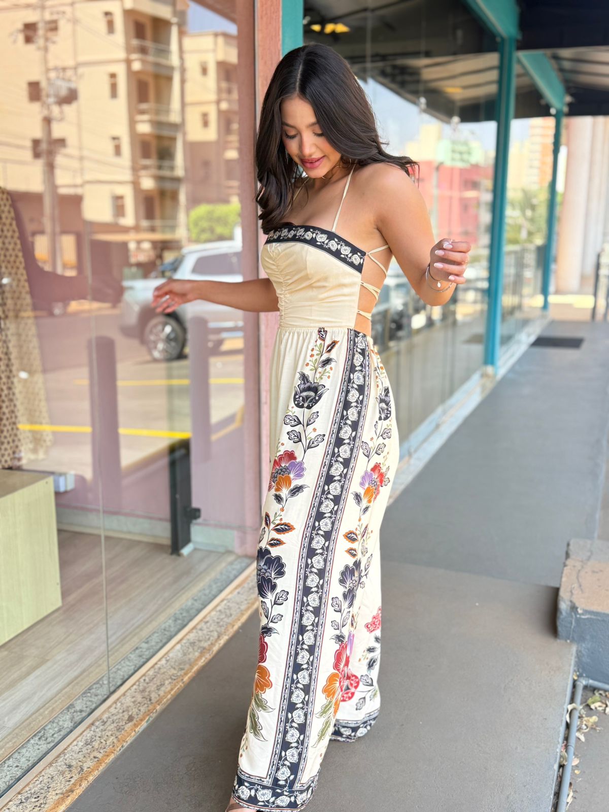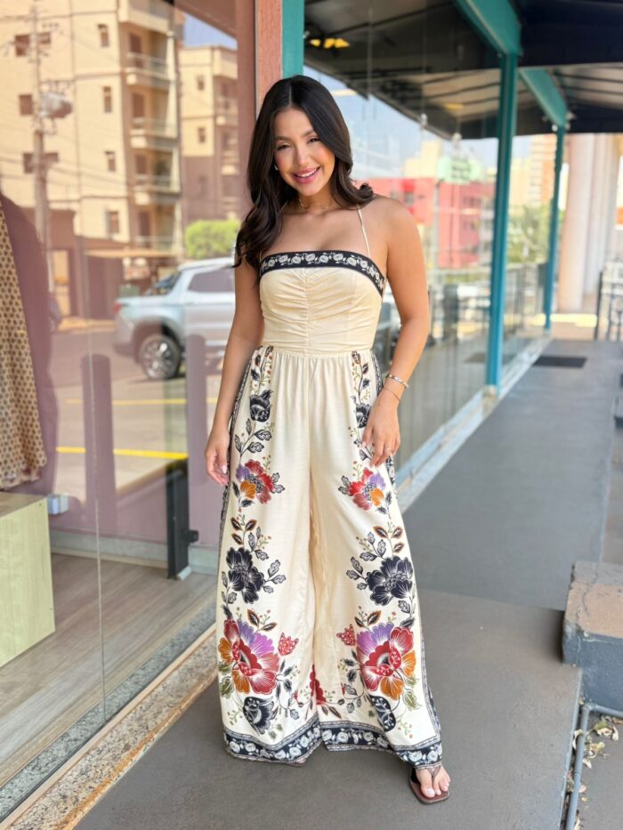 O macacão off white é confeccionado em tecido leve sem elasticidade. A peça levemente justa no busto e solta no comprimento possui decote reto, alças finas cruzadas na parte posterior e ajustáveis por amarração, detalhe de franzidos na altura do busto, mix de estampa em cores contrastantes e comprimento longo.