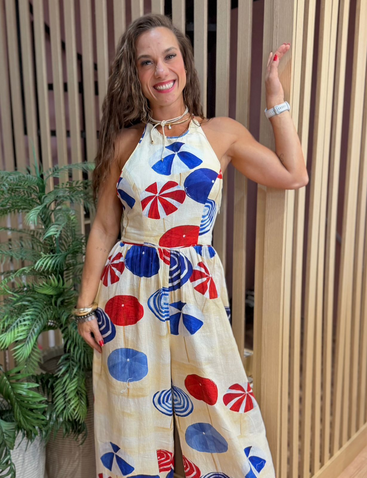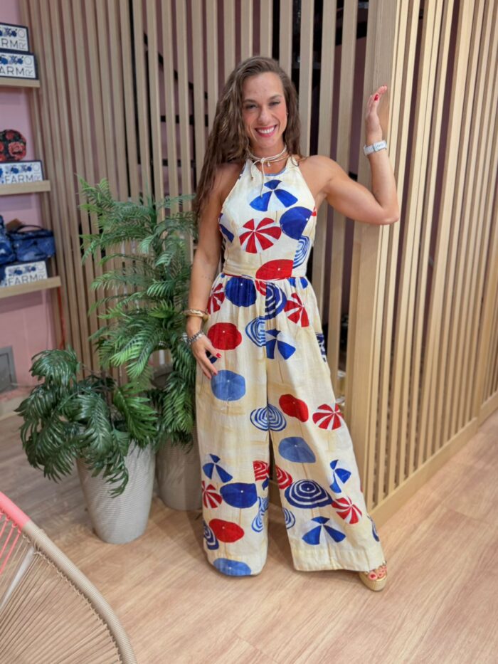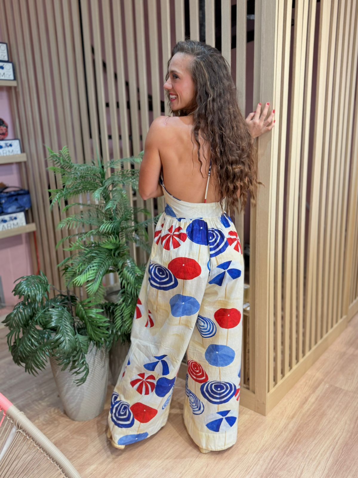 Modelagem conta com decote arredondado, acompanha alças finas finalizada em amarração na parte posterior. O fechamento se dá por zíper invisível na parte posterior. A calça é pantalona. Peça confeccionada em tecido leve e fluido, sem elasticidade.