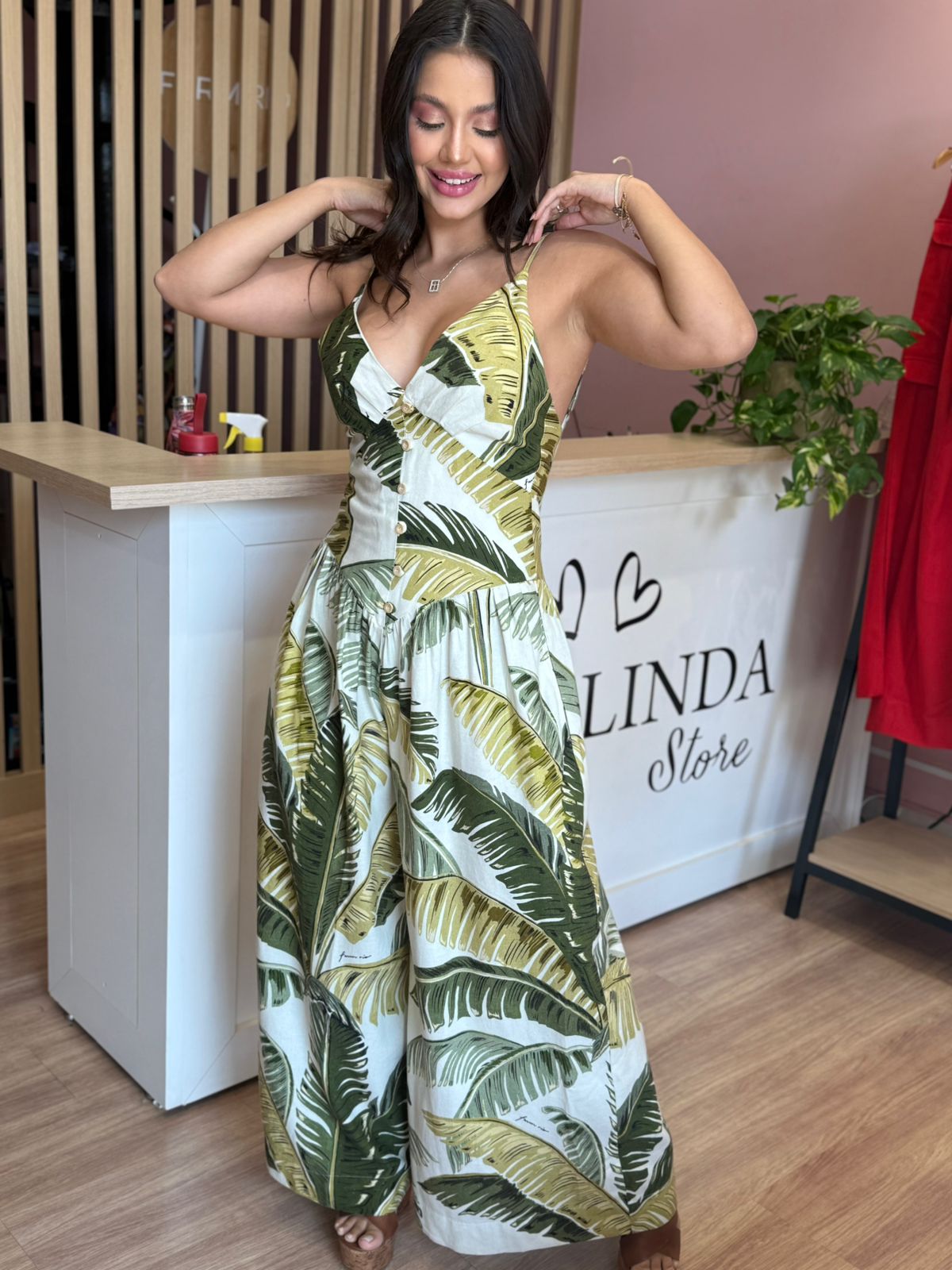 macacão pantalona estampado trancoso. possui alças finas e decote em v profundo, com ajuste impecável. a modelagem pantalona confere liberdade ao movimento, tornando-o ideal para um passeio à beira-mar ou um evento casual. tecido leve e fluido garante conforto e frescor ao longo do dia. FARM RIO original – verão 26.