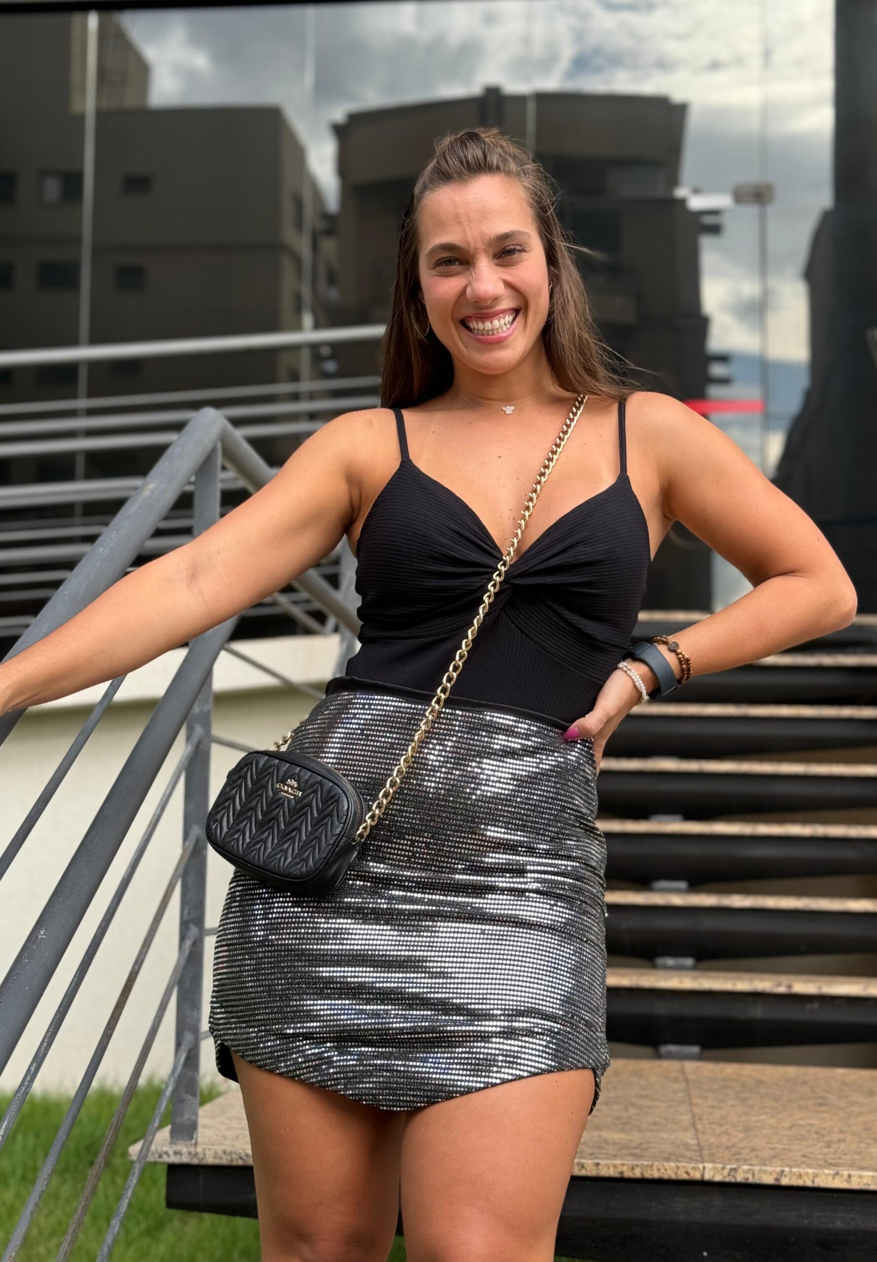 Descrição: Mini Saia Com Brilho Prata. Possui zíper invisivel atrás.