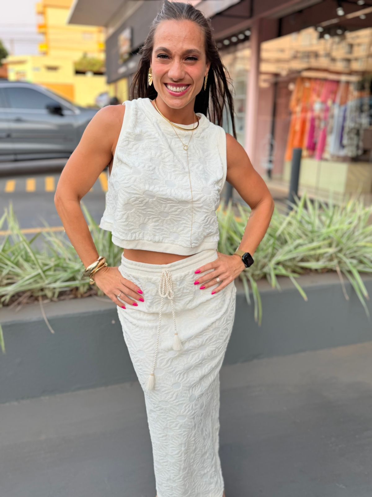 regata atoalhada. confeccionada em tecido macio, possui um corte reto que proporciona conforto e leveza. o modelo sem mangas traz praticidade, enquanto o acabamento canelado eleva o visual. ideal para combinações casuais ou produções mais elaboradas, garantindo versatilidade para diversas ocasiões. FARM RIO original – verão 26.
