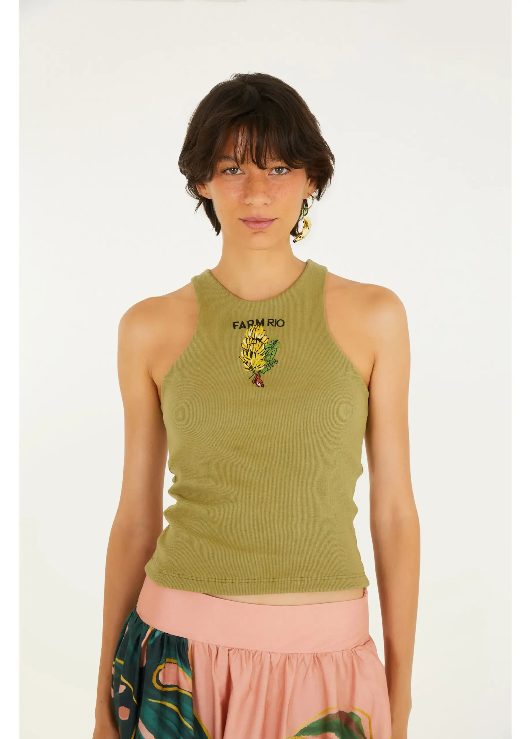 regata cacho de banana. o charme dessa peça está no decote redondo com acabamento impecável e nas alças que realçam os ombros. a modelagem é moderna, perfeita para um look casual. o tecido leve proporciona conforto em dias quentes, ideal para passeios ao ar livre ou encontros informais. FARM RIO original – verão 26.