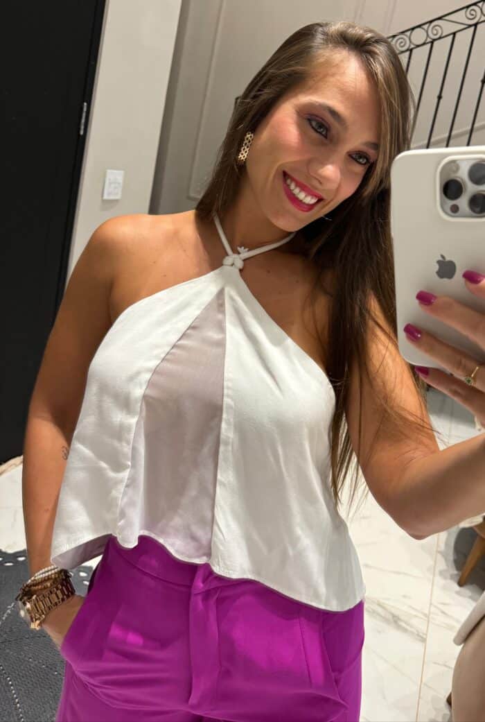 Descrição: Regata Halter Neck Transparência. Regata frente única. Aberta nas costas e com regulagem. E com uma leve transparencia na frete.