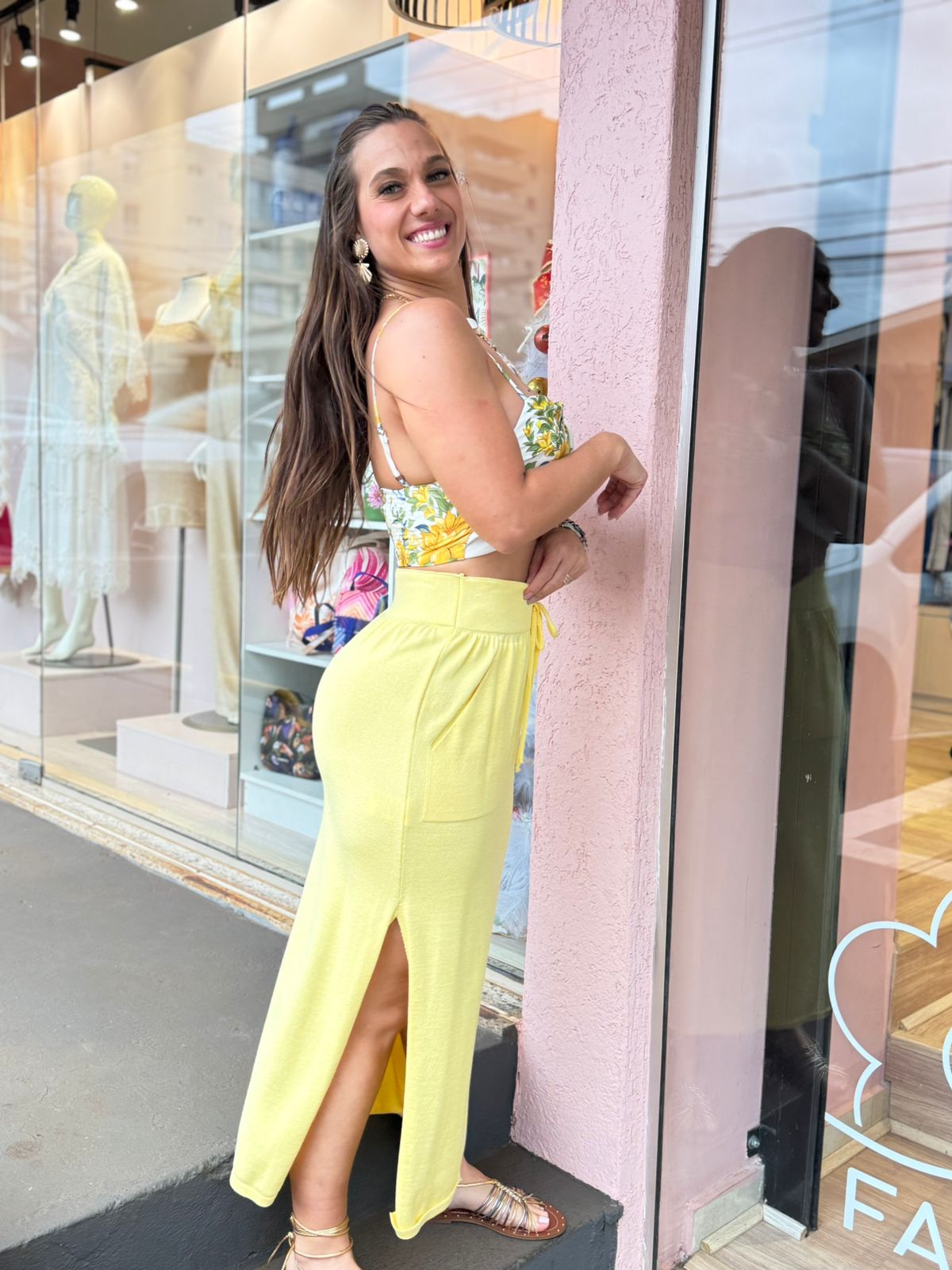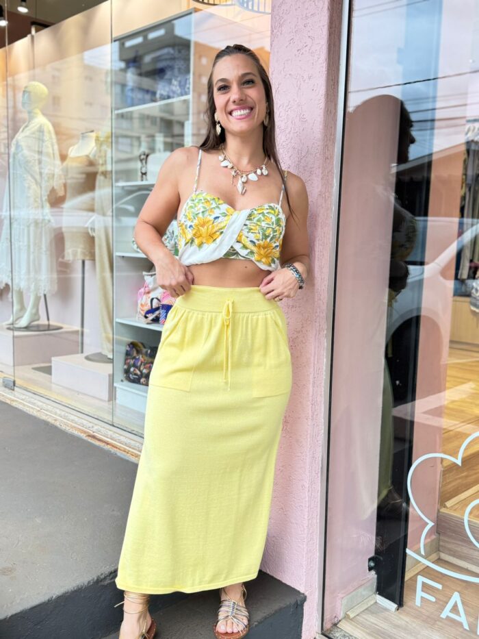 Saia em tricô, possui cós e amarração frontal e fendas laterais.