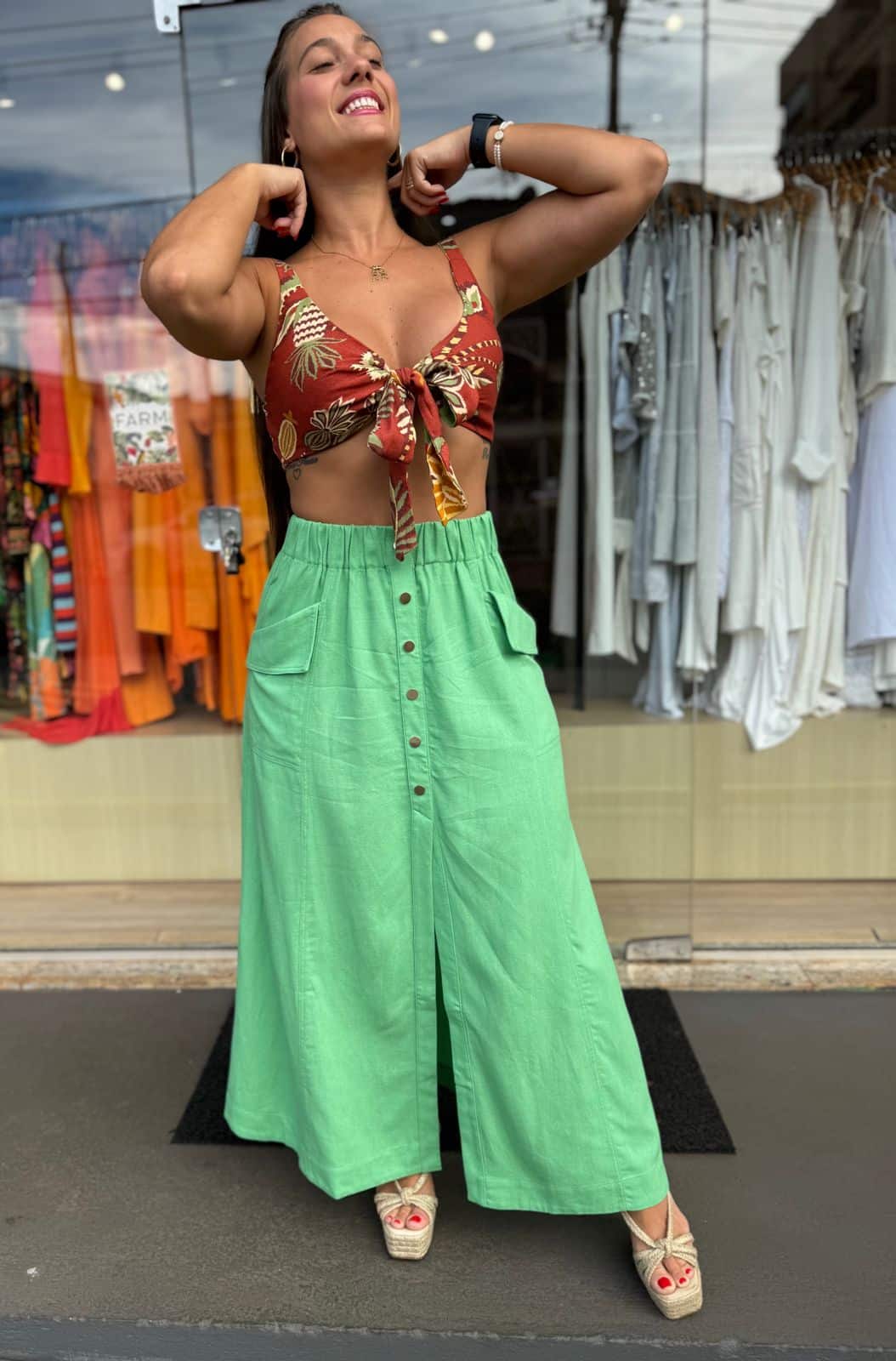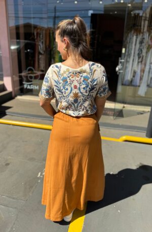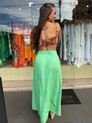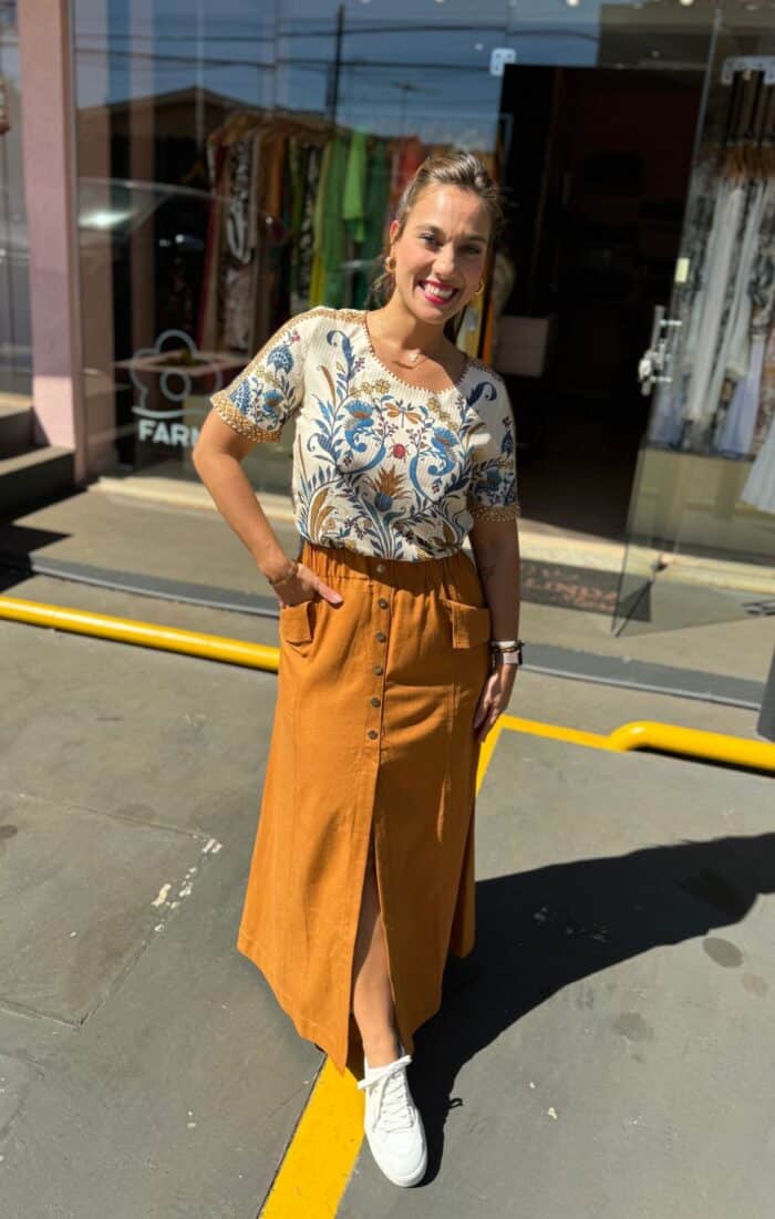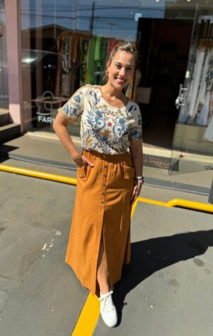 Descrição: Saia Midi Western Linho. Saia Midi com fenda frontal. Possui elástico na cintura. Saia em linho.