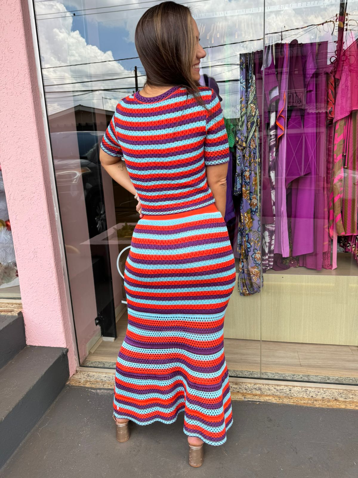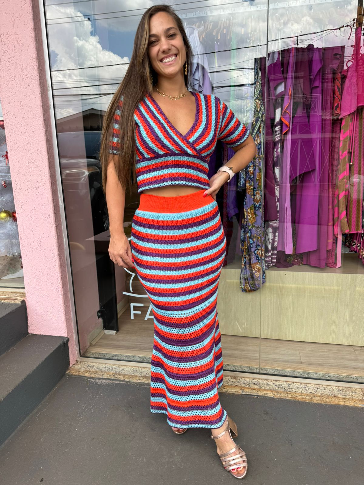 Descrição: Saia midi em trico modal. Listarada. Possui pala na cintura com elástico. Modelo justo.
