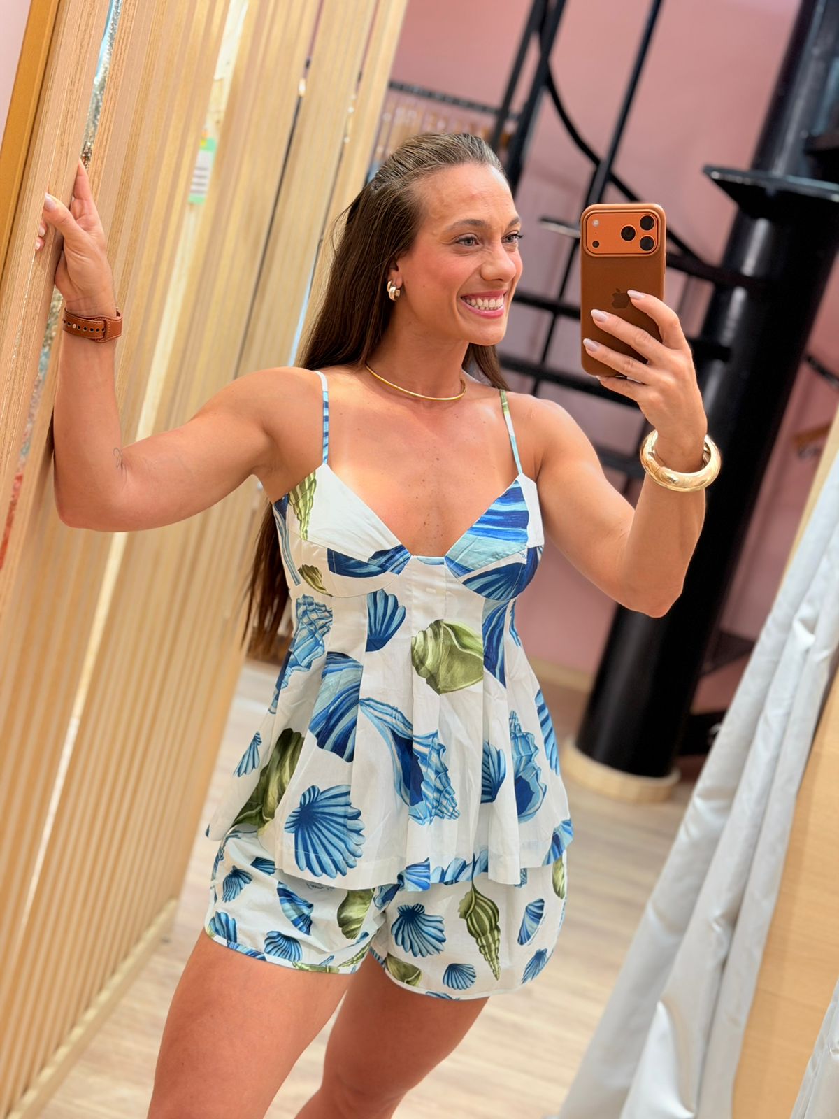 short estampado concha litoral. de alças finas e modelagem solta, este short apresenta leveza e conforto para os dias mais quentes. A estampa inspirada no litoral traz frescor e um toque de originalidade ao seu visual. perfeito para passeios à beira-mar ou um encontro casual. FARM RIO original – alto verão 26.