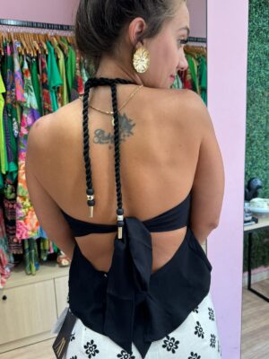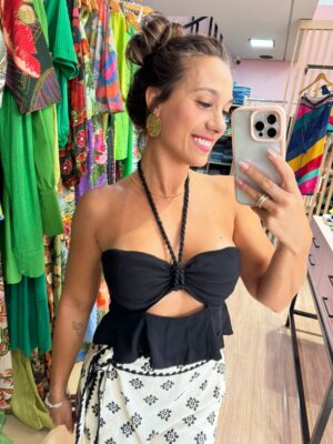 Descrição: Top Babado Detalhe Amarração All´s. Top possui comprimento cropped, possui drapeados na parte do busto, amarração em cordão, detalhes em babado, fechamento na parte traseira em amarração e botão e barra inferior com acabamento simples.