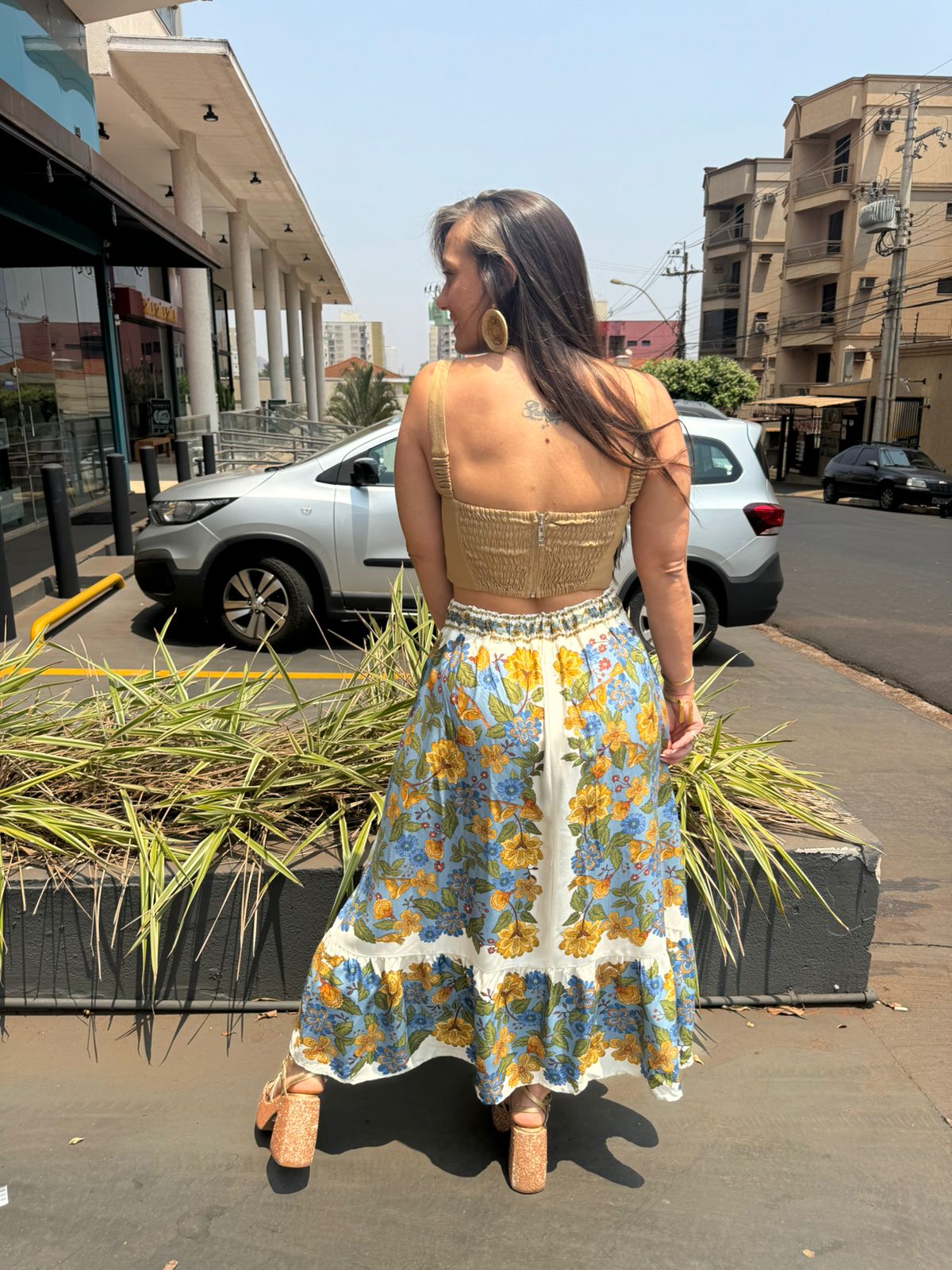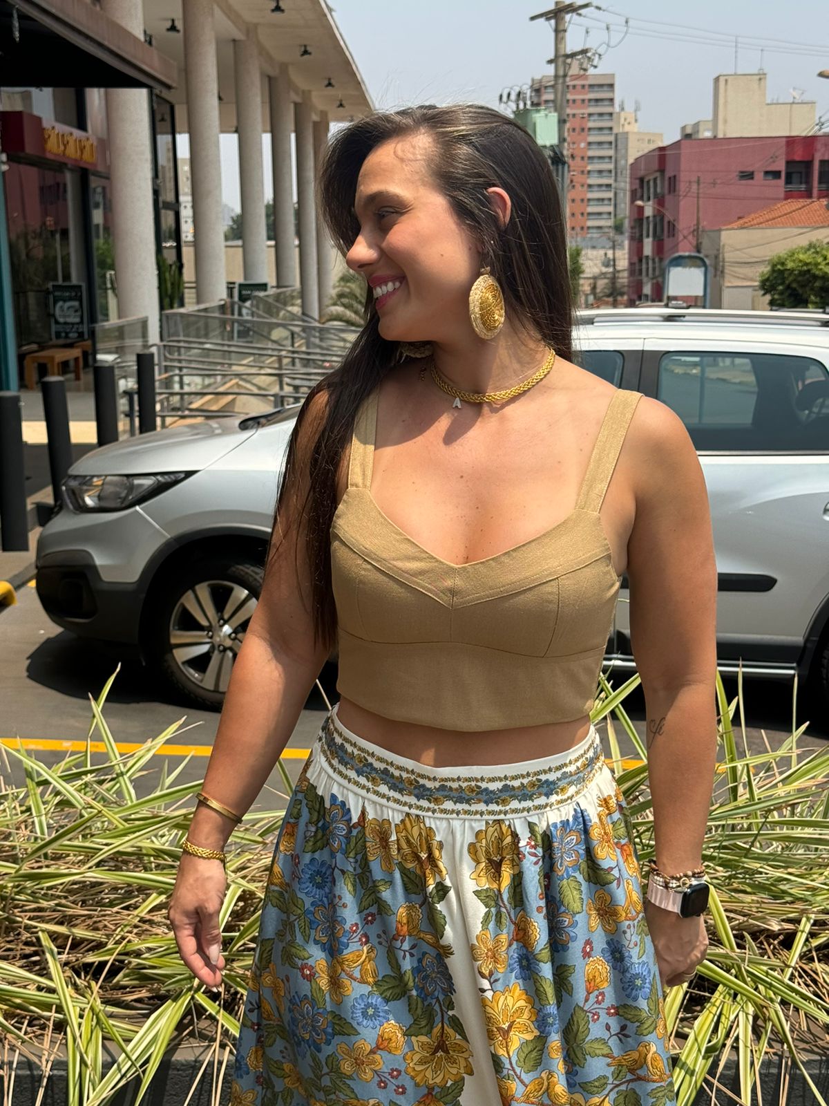 Descrição: Top Estruturado em linho comprimento curto , e alças finas , com elástex atrás e fechamento a zíper.