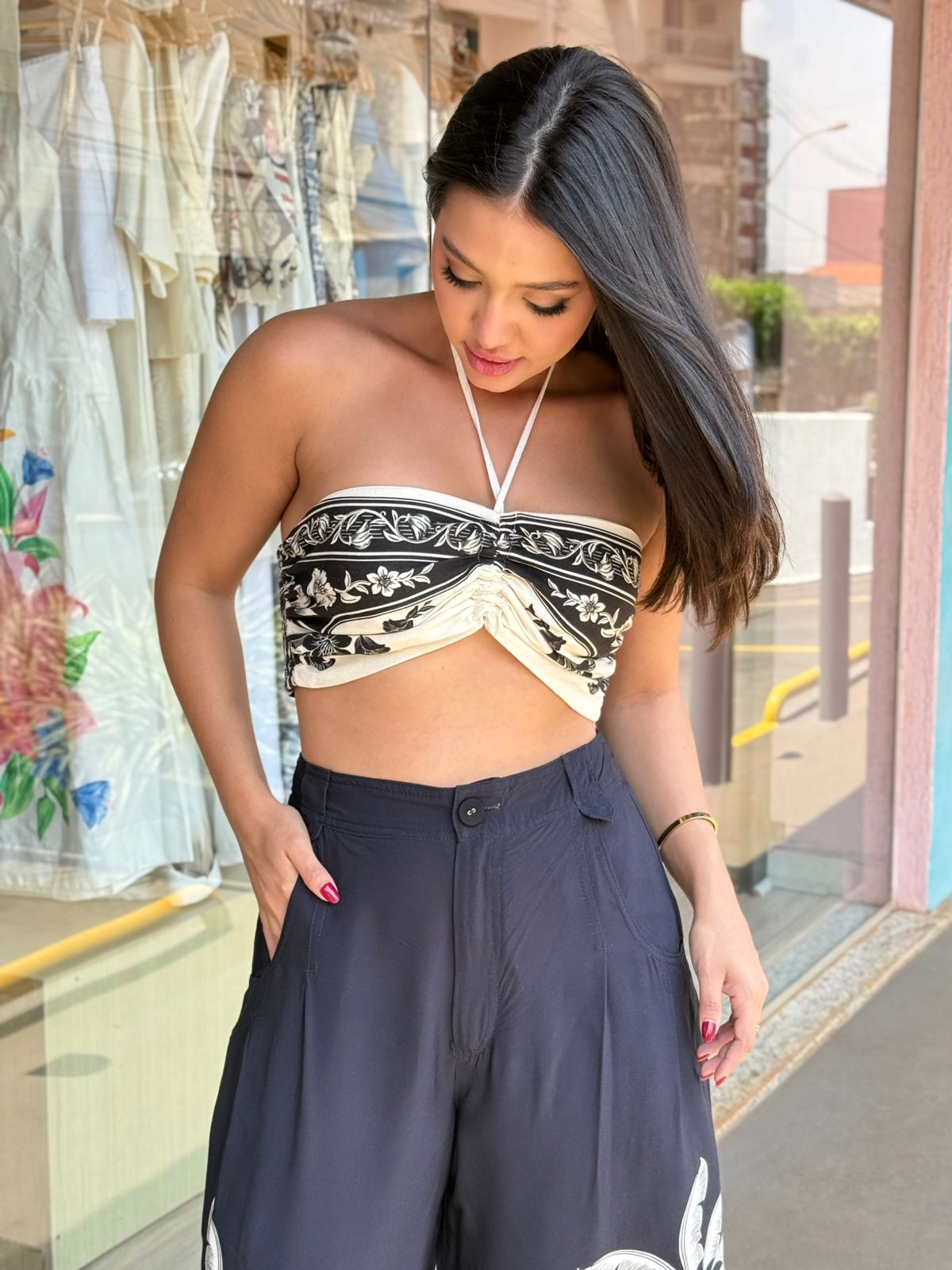 top estampado guanacaste traz frescor com seu design sem alças e amarração frontal, garantindo versatilidade e charme. a modelagem ajustável permite conforto e estilo para qualquer ocasião, do passeio no parque ao jantar descontraído. peça indispensável para quem busca originalidade. FARM RIO original – verão 26.