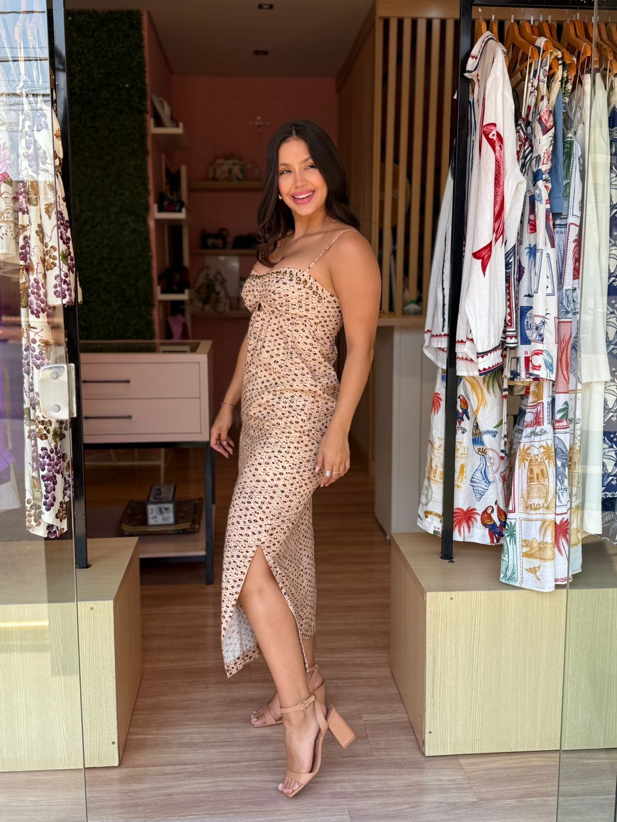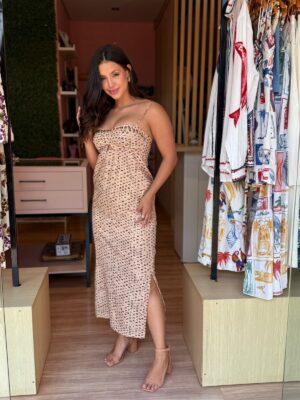 O Vestido Alça Estampa Ink traduz a essência do verão em um visual leve e marcante. A modelagem fluida em linho com viscose traz frescor e movimento, enquanto o forro em viscose garante conforto. Seu busto estruturado com recorte e detalhe de pequenas aberturas adiciona charme contemporâneo, e as aplicações em tachas no decote valorizam a peça com um toque artesanal sofisticado. A estampa geométrica em tons terrosos e azulados conecta-se ao universo boho da coleção, oferecendo versatilidade e autenticidade para diferentes ocasiões.