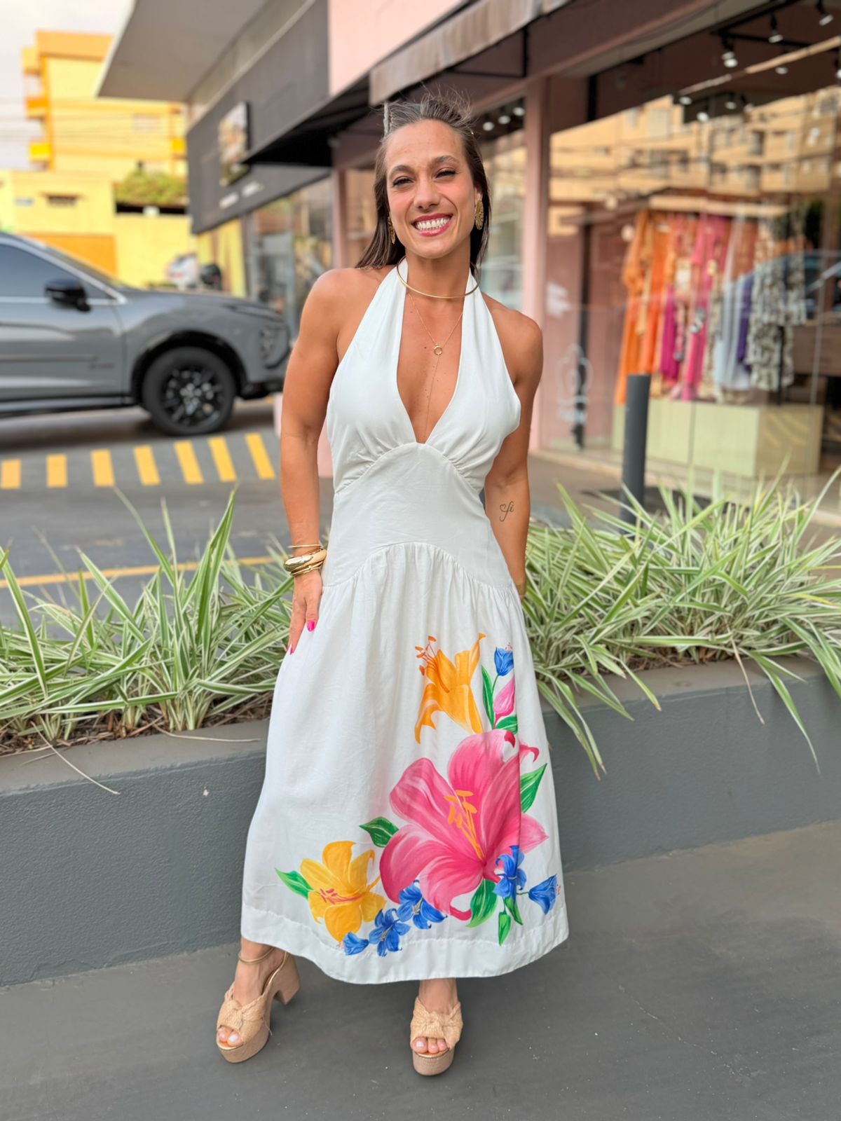 Modelagem possui decote em V e alças em tecido que seguem até o pescoço para fechamento, acompanha abertura na parte posterior. A saia é ampla. Peça confeccionada em tecido leve e sem elasticidade.