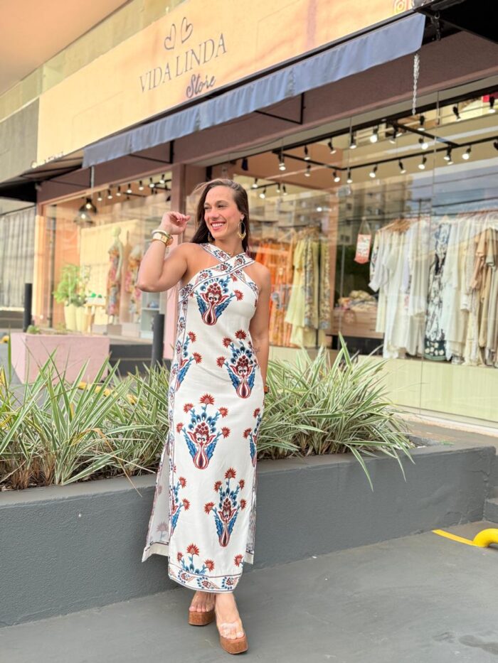 vestido longo estampado indra. com alças finas e decote alto, esse vestido tem um caimento leve que traz fluidez aos movimentos. as nuances da estampa e o tecido de viscose oferecem conforto e estilo, perfeito para ocasiões que pedem naturalidade e frescor. ideal para dias casuais que se transformam em noites especiais. FARM RIO original – verão 26.