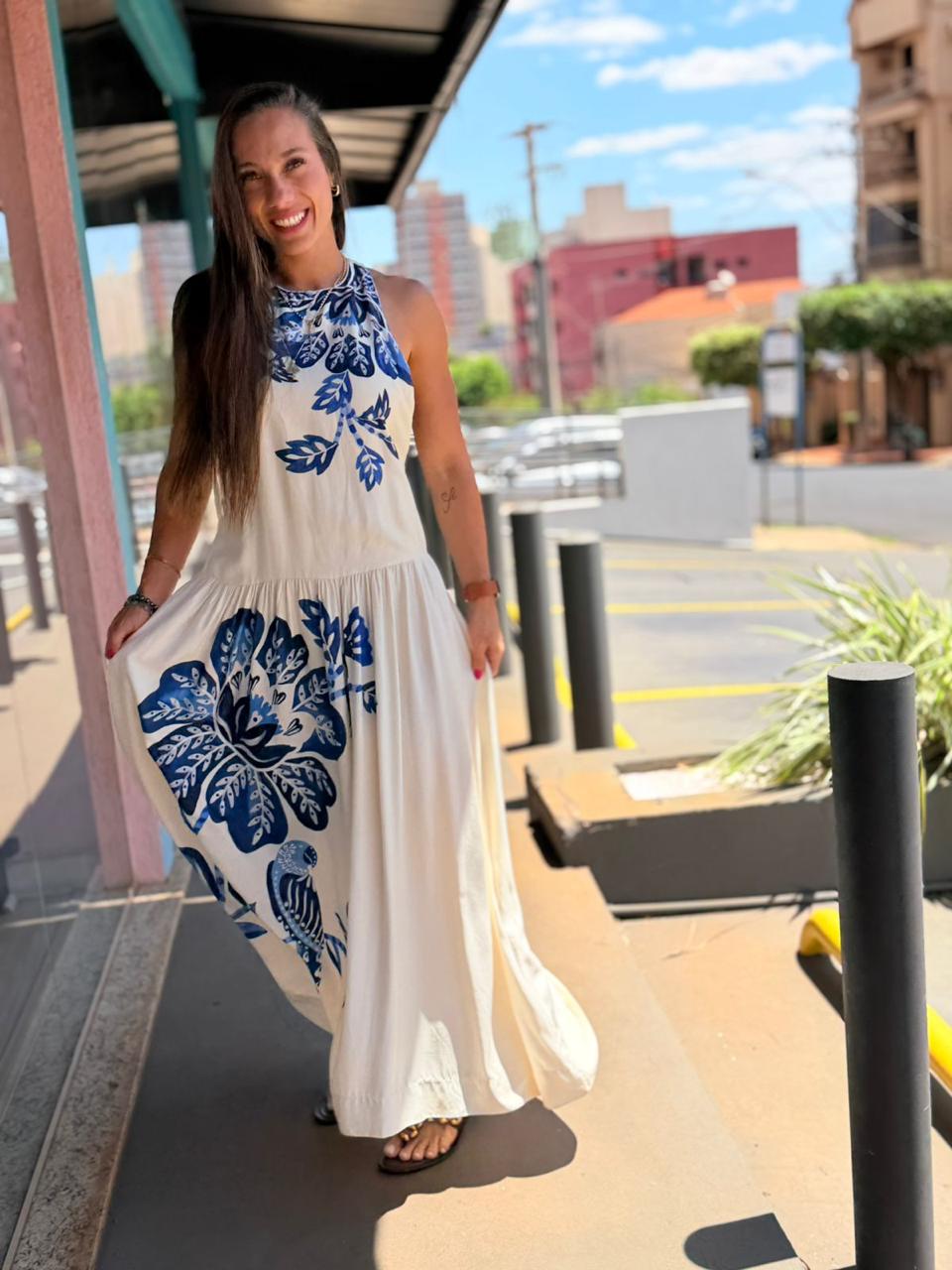 Com corte fluido, alças finas e estampa exclusiva, une leveza e identidade tropical. Versátil para o dia e elegante para a noite.