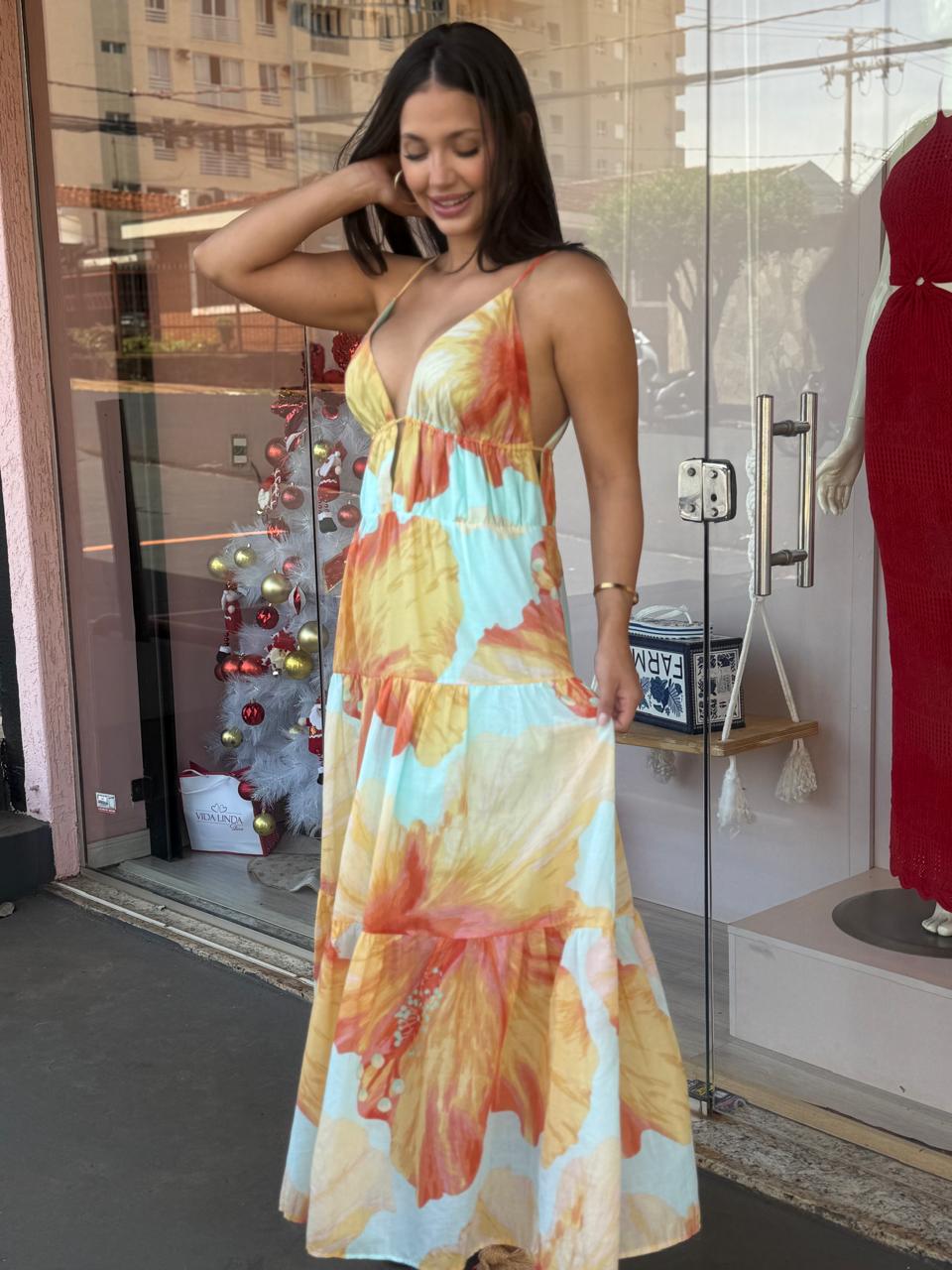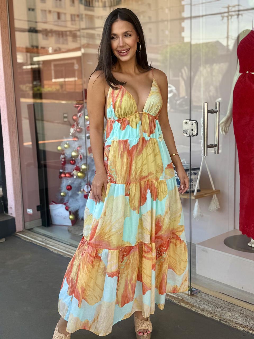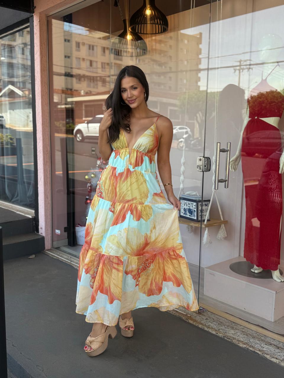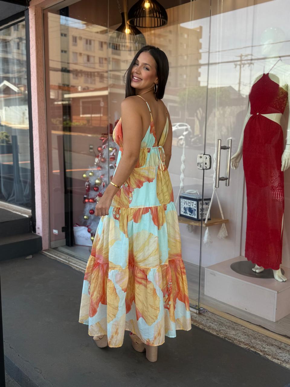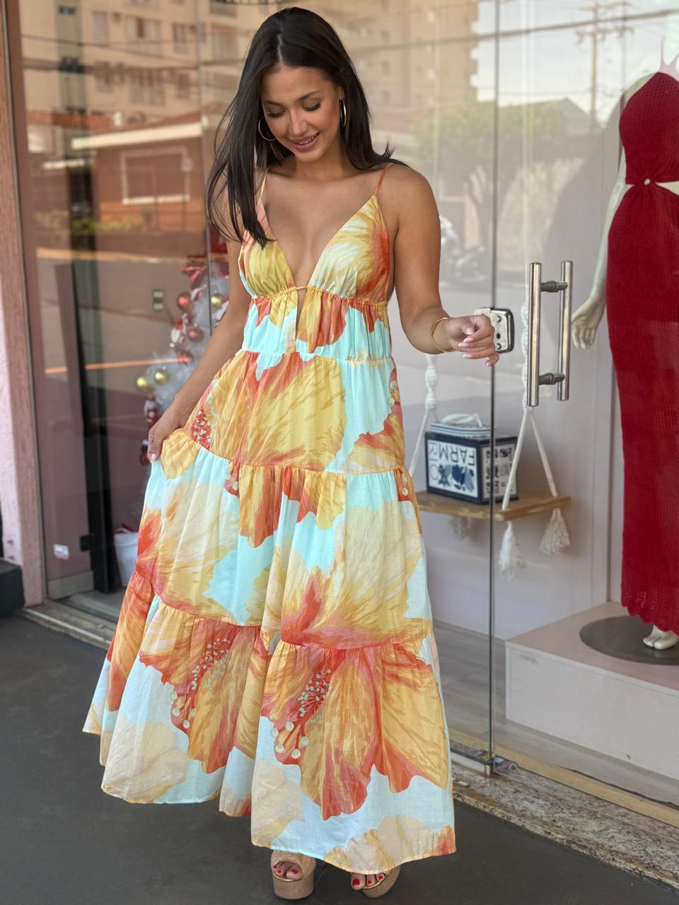 vestido longo estampado vestida de flor. possui alças finas e decote profundo, trazendo leveza e um toque especial. a saia ampla e fluida complementa a modelagem soltinha, proporcionando movimento e conforto. perfeito para ocasiões casuais e momentos ao ar livre, com o charme que só a farm oferece. FARM RIO original -alto verão 26.