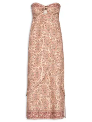 vestido rosa é confeccionado em tecido leve com toque de linho sem elasticidade. A peça justa ao busto e solta no comprimento possui decote coração, recorte frontal vazado com aplicação de anel metálico, efeito drapeado no busto, aba sobreposta abaixo do busto, elástico na parte posterior, mix de estampas, fendas laterais e comprimento midi.