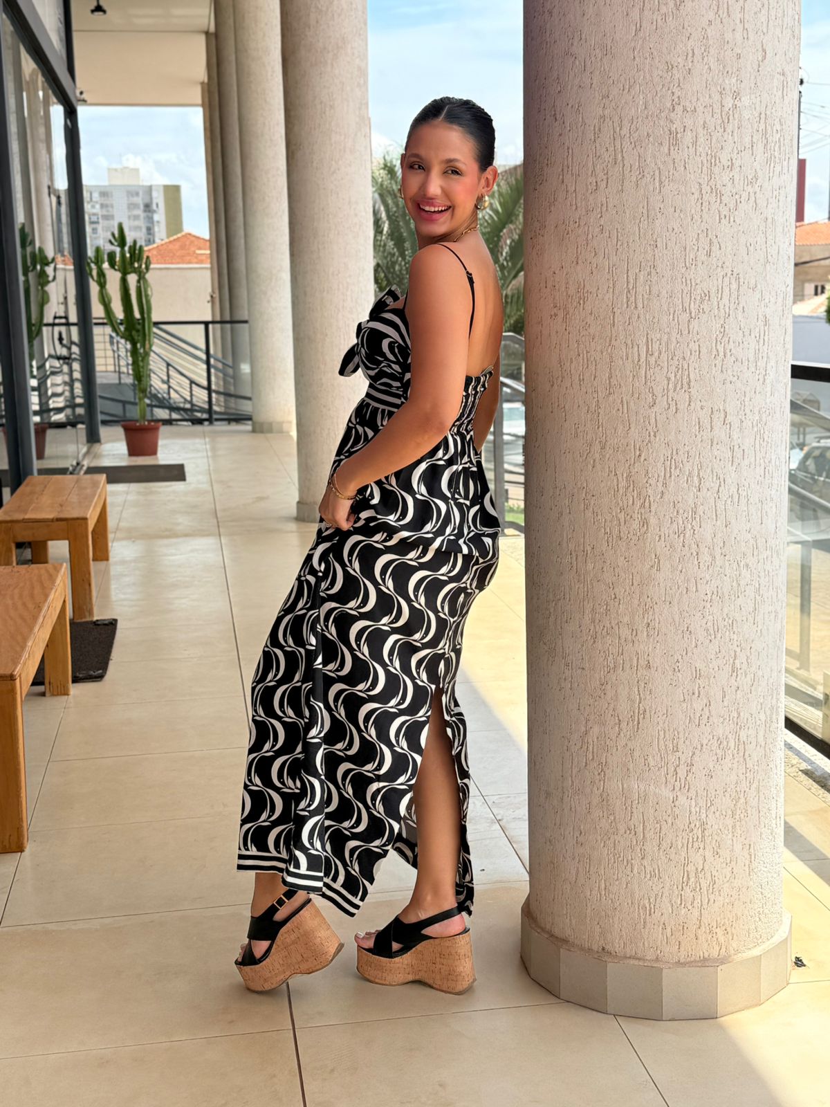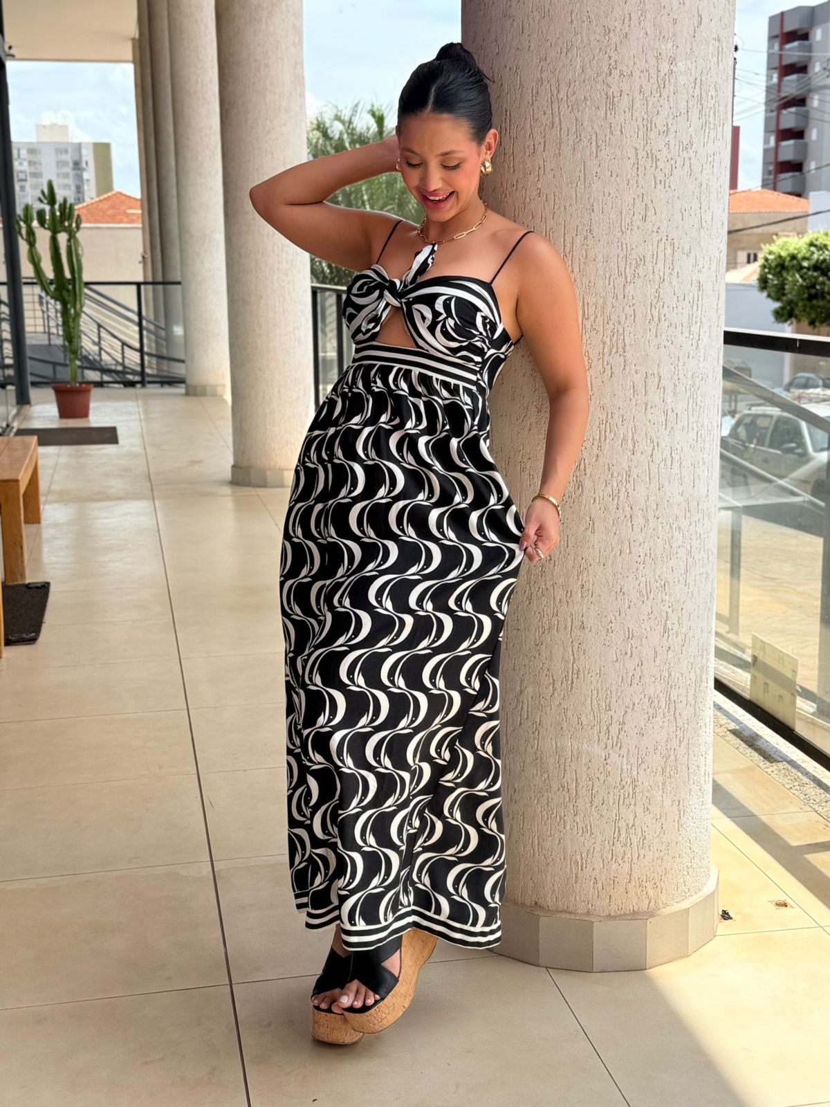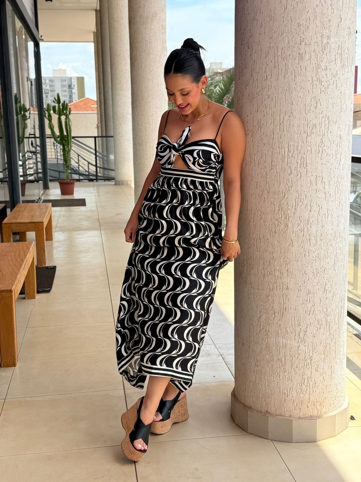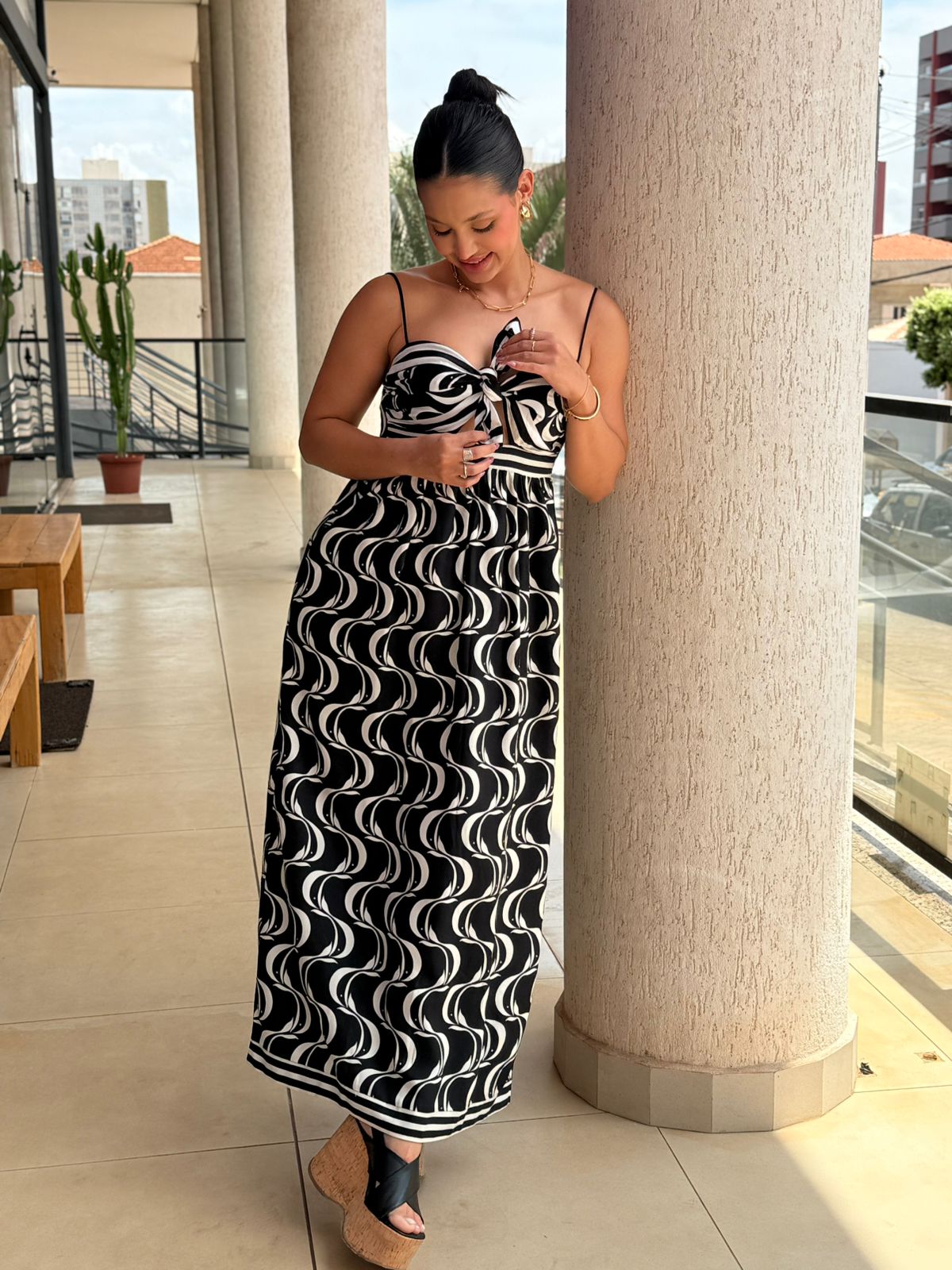 vestido nó estampado peixe copa. com alças finas e decote com detalhe de nó central, traz um toque criativo à peça. o comprimento longo tem caimento fluido perfeito para dias ensolarados. ideal para eventos casuais e passeios ao ar livre, ele combina com momentos de leveza e estilo. FARM RIO original – verão 26.