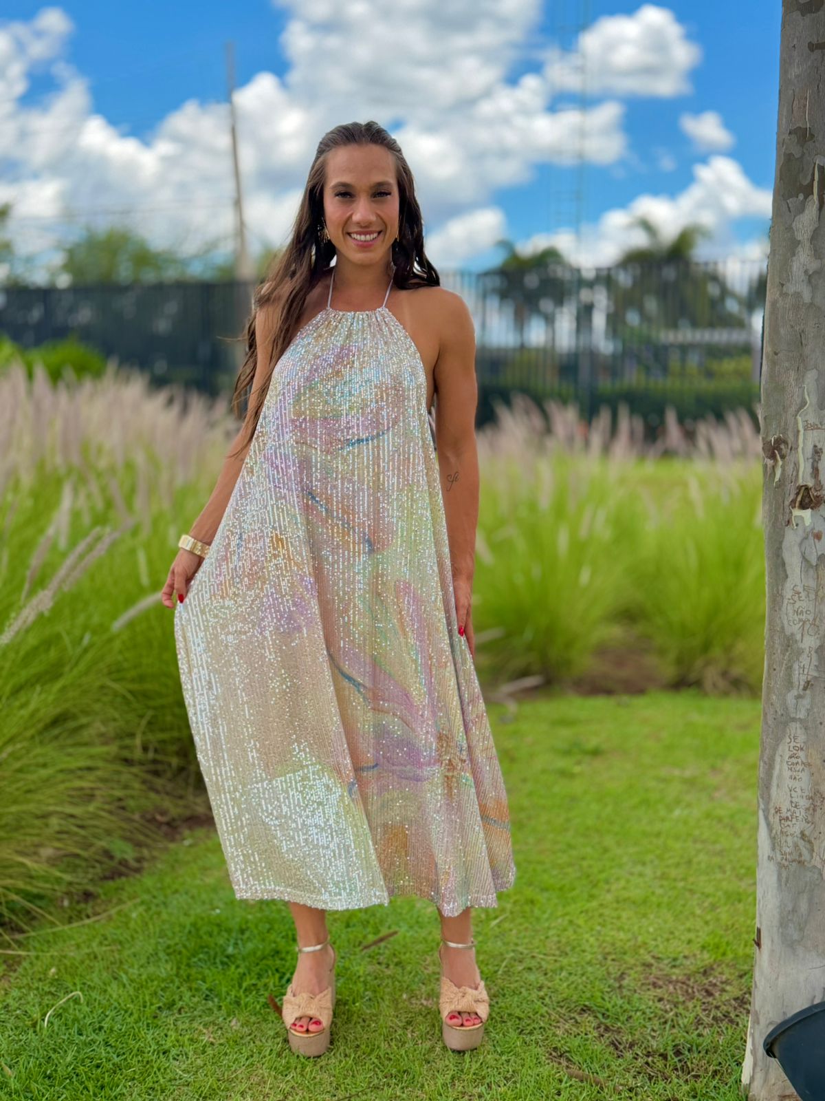 O vestido rosa é confeccionado em tecido com média elasticidade. A peça solta ao corpo possui decote halter, alças finas com miçangas nas pontas para amarração posterior na altura da nuca, decote posterior vazado, mix de estampas em cores contrastantes, superfície em paetê, forro e comprimento midi. FARM RIO original – verão 26.